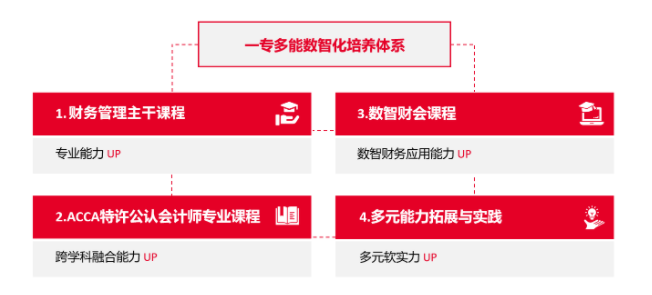 财务管理ACCA方向班将英国特许公认会计师(ACCA)资格考试的13门课程纳入财务管理本科课程体系,使得ACCA方向班学生在财经知识方面“学贯中西”,其课程采取校内考核方式学生取得相应的毕业学分,同时组织ACCA方向班学生参加非免试的10门ACCA专业课程全球统考。