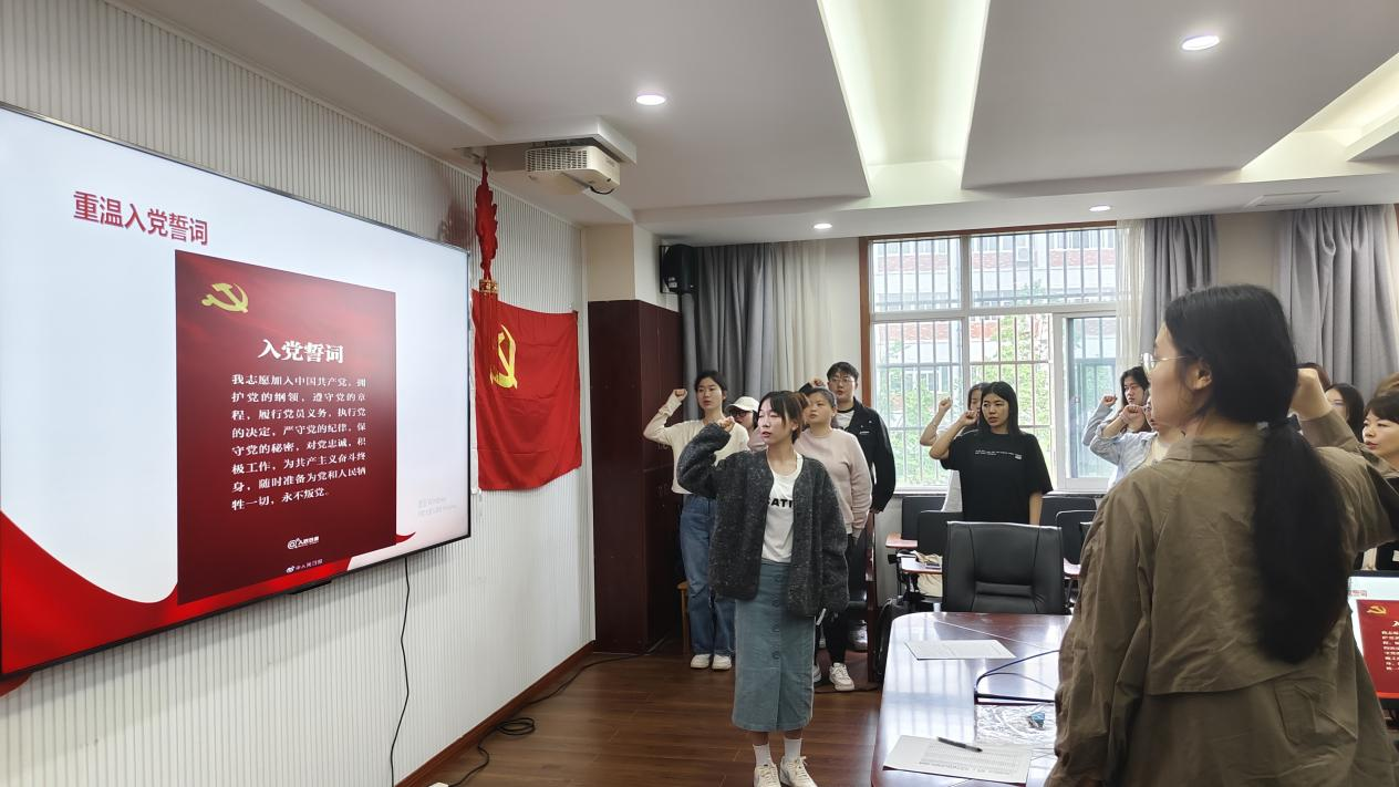 本次会议有两项内容,一是进行4月份支部主题党日学习;二是对2024届毕业生党员相关事宜进行说明和布置。会议开始,全体起立,奏唱国歌。随后,由徐心怡同学代领全体成员重温入党誓词,学习4月份支部主题党日的相关内容。学习分别从基层党支部学习指导、总体国家安全观、加强党的纪律教育和学习三个方面进行,之后又组织大家学习习近平总书记重要讲话和精神及省、市有关重要会议精神。学习结束后,与会学生代表纷纷发表感言,表示要不忘初心、牢记使命,主动学习党的思想政策,为社会发展做贡献。