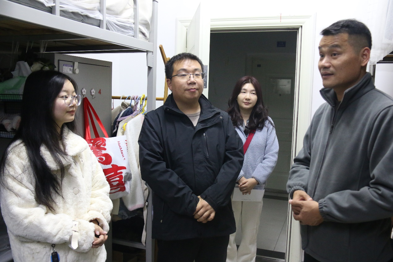 (辅导员郭晶晶和李筱雅走访学生寝室)