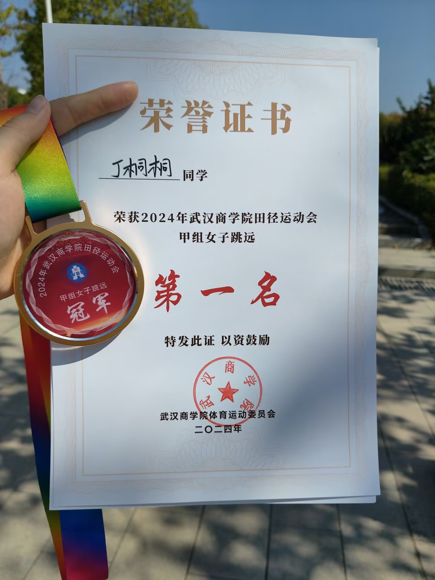 丁桐桐同学在跳远项目中发挥出色,她助跑迅猛,起跳有力,在空中划过一道优美的弧线后,稳稳落地,以优异成绩摘得跳远第一名的桂冠,其出色的弹跳力和身体协调性令人赞叹。