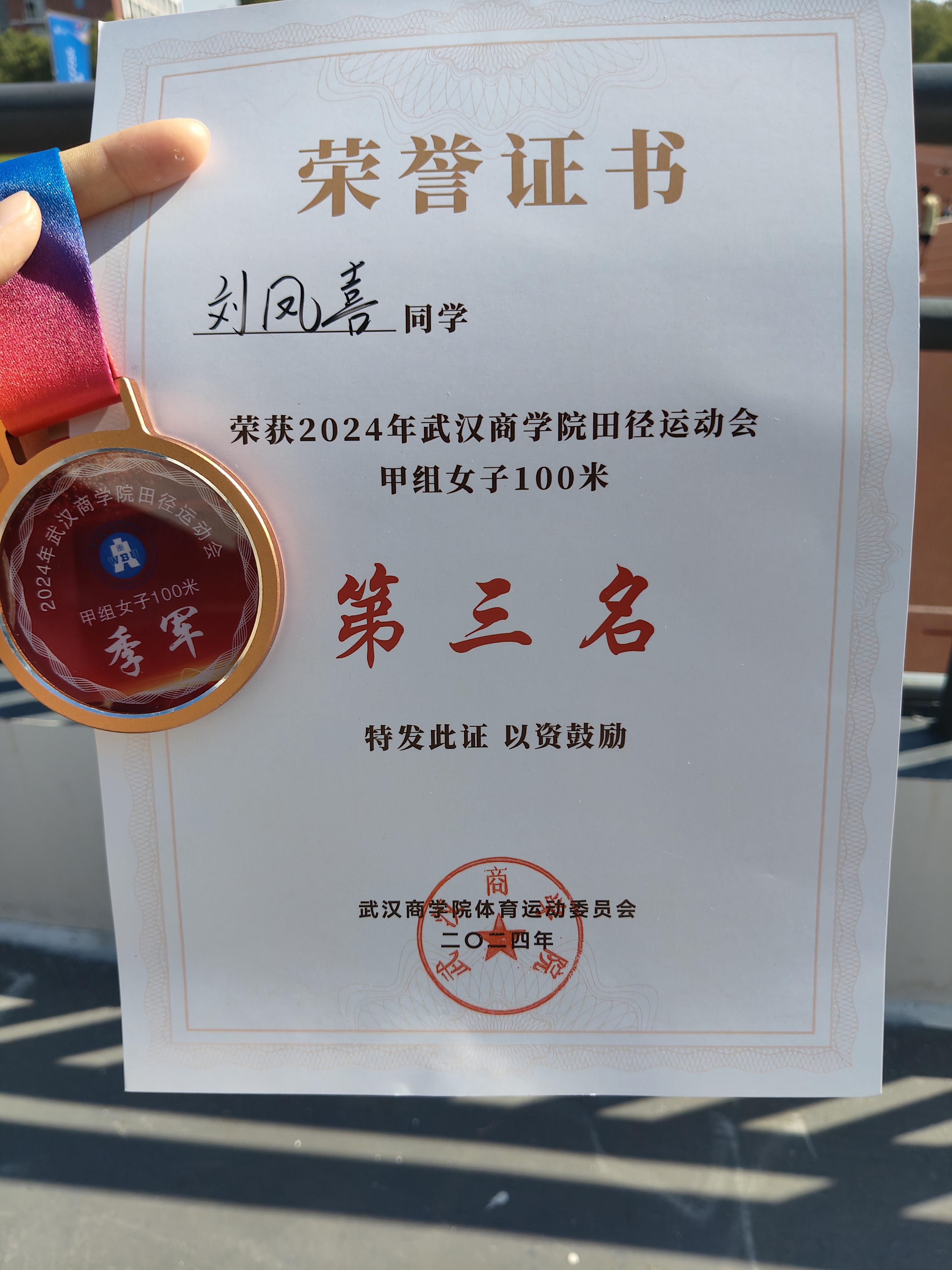 刘凤喜同学则在100 米短跑赛场上崭露头角,她以风驰电掣般的速度冲向终点,凭借顽强的拼搏精神和出色的短跑能力,荣获 100 米第三名的佳绩,为学院荣誉榜再添光彩。
