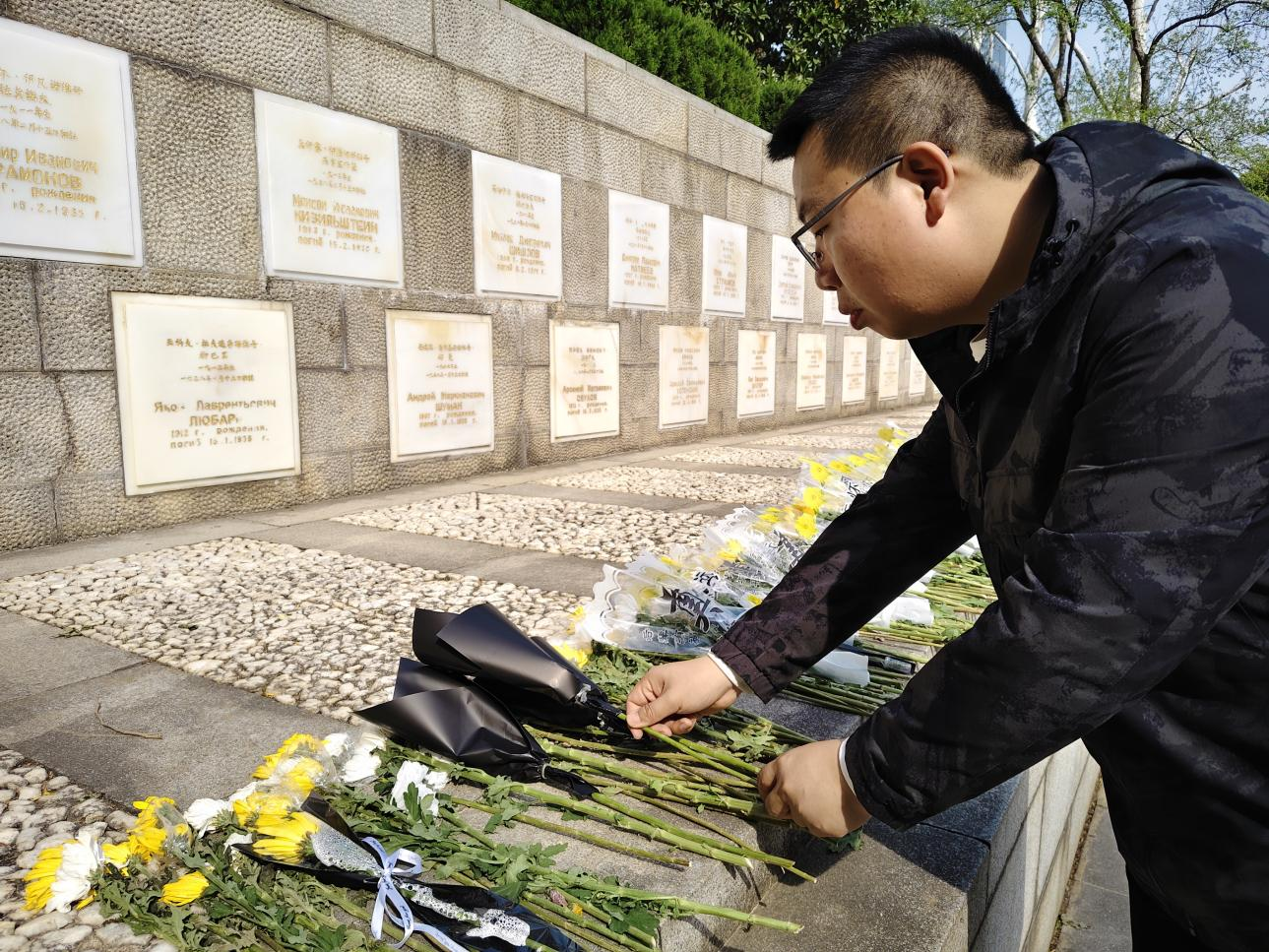 随后,同学们前往解放公园苏联空军志愿队烈士墓,向抗战英雄致敬献花,师生们垂首默哀,用无声的追思告慰英灵,缅怀曾在中国人民抗日战争特别是在武汉保卫战中建立不朽功勋的苏联空军志愿队烈士。烈士墓前汉白玉方尖碑耸立着,默默诉说着八十多年前武汉空战的激烈与悲壮,以库里申科和拉赫曼诺夫为代表的236名苏联志愿援华飞行员与中国军民并肩奋战,铁血悲歌的不屈精神共同铸就了抗战丰碑。