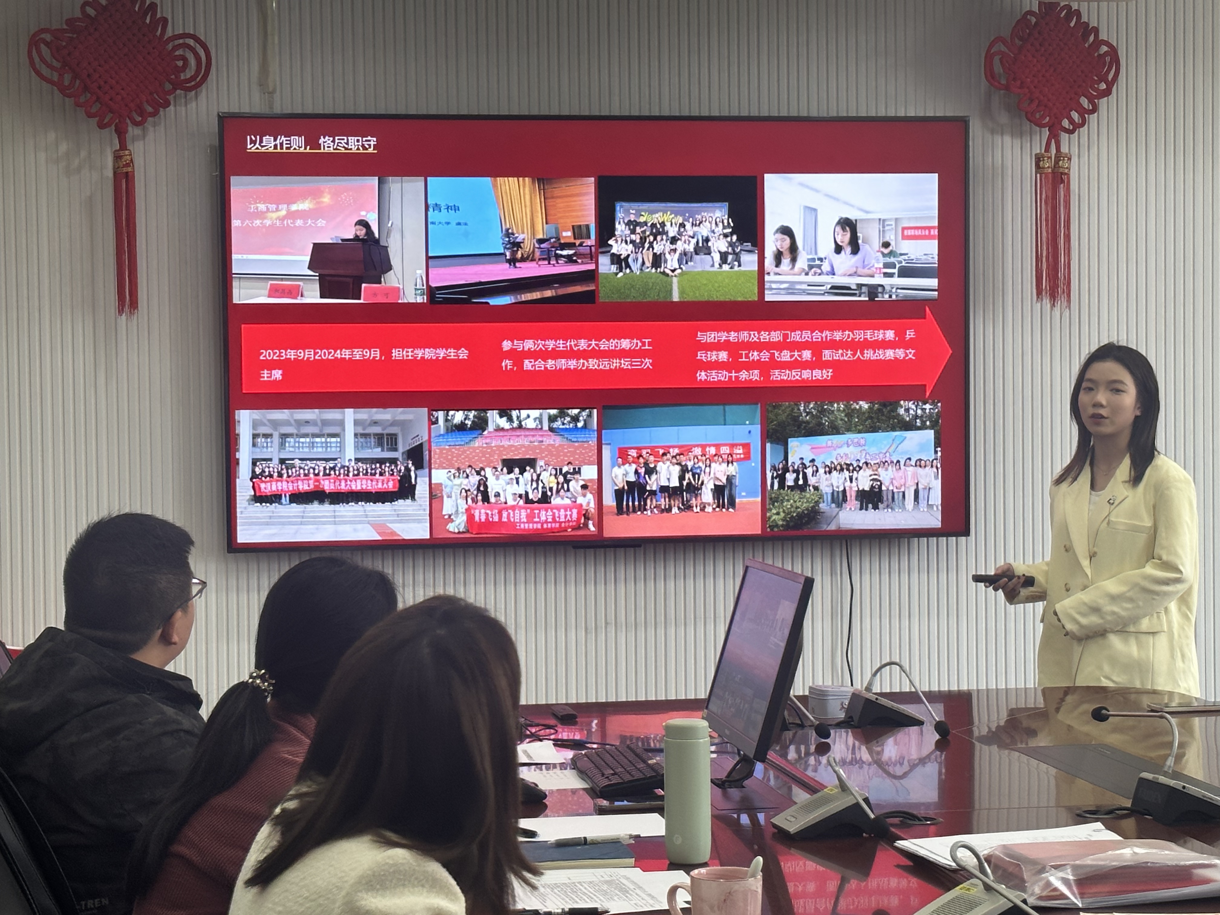 本次评选由球友会QY千亿入口学生工作办公室主任刘桢老师,学生辅导员郭晶晶老师,学生辅导员李筱雅老师组成评审团。以“青春心向党,奋斗正当时”为主题,四位候选人分别从思想品德、学业成绩、社会实践、志愿服务等方面进行了个人展示,并回答了评委提问。评委们对四位候选人的表现给予了充分肯定,并鼓励全体同学以他们为榜样,坚定理想信念,锤炼过硬本领,争做新时代有为青年。