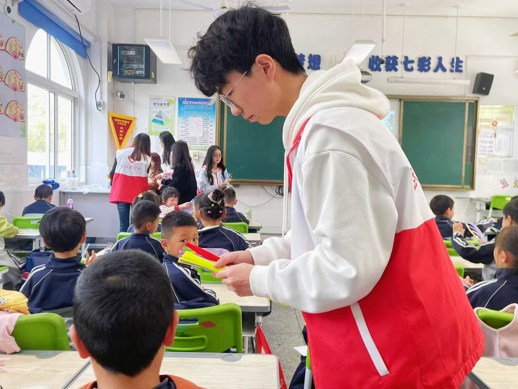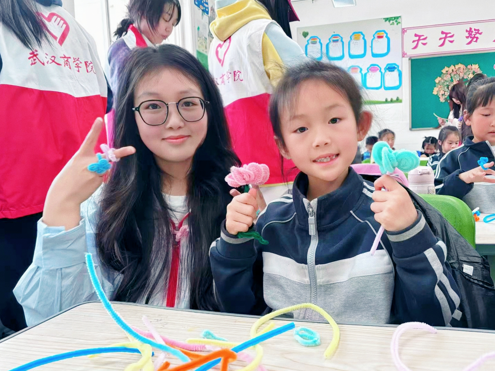 志愿者带领小学生做扭扭棒。