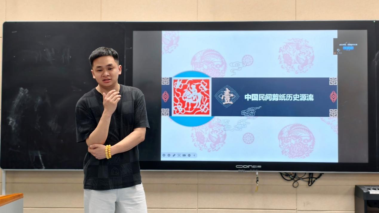 (周坤老师给薛峰小学同学们讲解剪纸的历史源流)