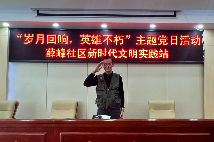 比影像更鲜活的,是历史的亲历者。本次活动特别邀请到退役老兵刘爷爷,他的到来让现场瞬间响起热烈的掌声。怀着满腔热忱,刘爷爷缓缓打开了记忆的闸门:1969 年,他怀揣着对祖国的赤诚自愿参军,在部队的五年时光里,与战友们同吃同住、同甘共苦,在艰苦的环境中磨炼出钢铁般的意志。“我们那时不怕吃苦、敢打敢拼,心里想的全是保卫祖国。” 刘爷爷的话语朴实却铿锵,他说当年的行军之路不仅是脚下的征途,更是承载国家未来的希望之路,保卫祖国的使命早已融入每一位战士的血脉,扛在坚实的肩上。发言尾声,刘爷爷缓缓起身,向在场师生郑重行军礼,那标准的姿势与坚定的眼神,彰显着 “时刻听从祖国召唤” 的不变初心,现场再次响起经久不息的掌声。