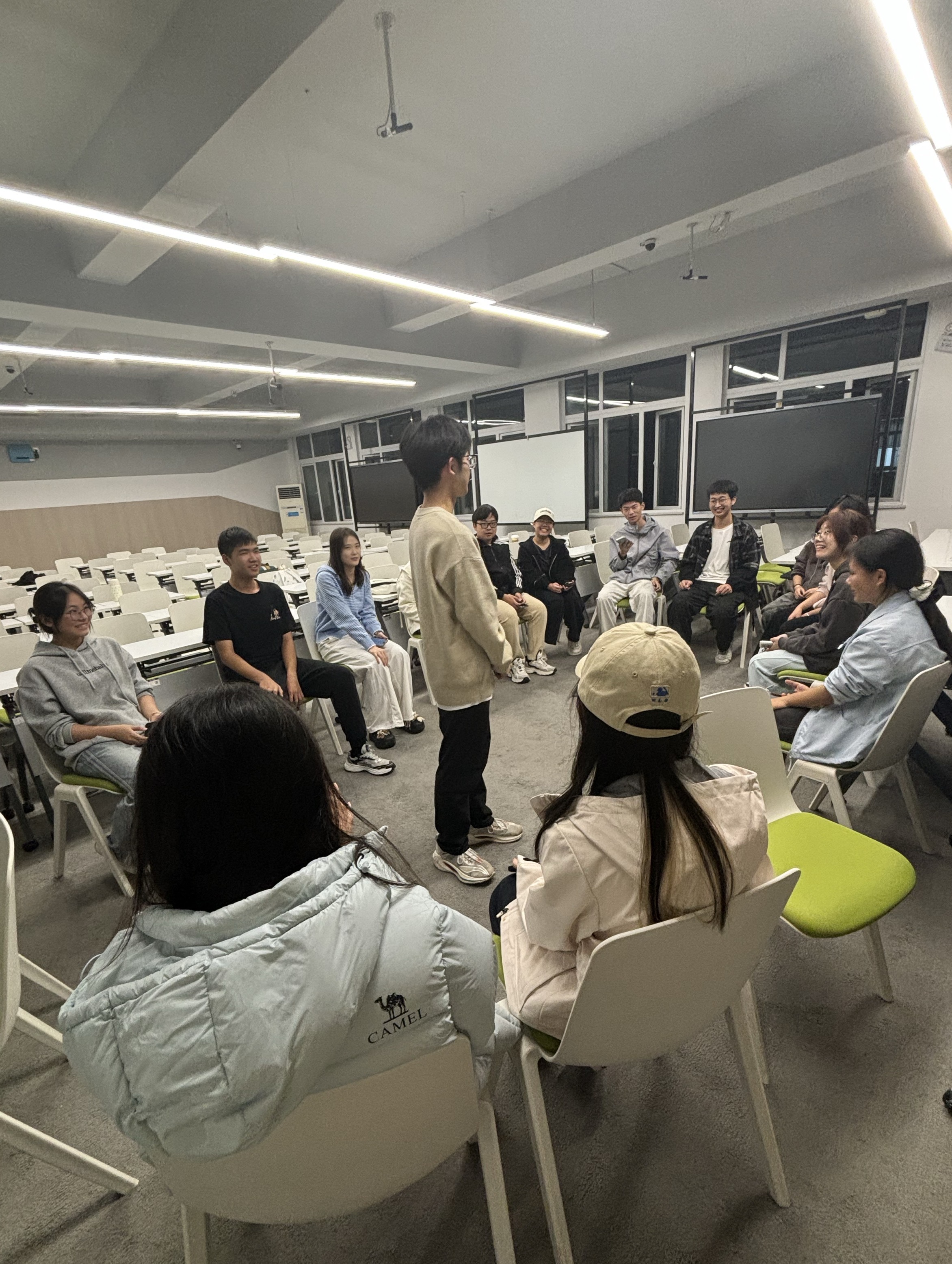 “大风吹!”“吹什么?”“吹穿黑色鞋子的人!”随着指令响起,同学们迅速起身换座,动作快的抢占空位,稍慢的则大方表演才艺,歌声、笑声瞬间填满了整个场地。原本略显拘谨的氛围被彻底打破,陌生感在一次次互动中消散,熟悉感在欢声笑语中滋生。