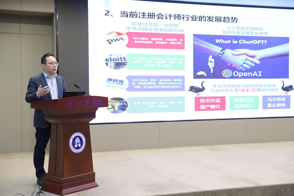 企业是人才培养的 “需求端”,更是产教融合的 “主力军”。随后,以天职国际会计师事务所(特殊普通合伙)武汉分所所长熊尧为单位的行业专家先后登台发言,结合行业发展实践与企业用人需求,分享了对产教融合的深度思考与合作愿景。熊尧所长以会计行业数字化转型为切入点,他谈到,当前财务智能化、AI 审计已成为行业发展的核心趋势,企业对会计人才的需求已从传统核算型转向 “技术 + 业务 + 管理” 复合型,既要求熟练掌握财务软件操作、数据分析技能,又需具备行业场景理解与风险把控能力。由此,他提出天职国际人才培养体系的六个维度,分别是注重职业道德、专业水平、沟通协调、项目管理、商务意识、成长需求等。湖北龙华联合会计师事务所姜南所长结合中小会计师事务所的发展实际,分享了资源短缺、人才流失等行业痛点。她表示,湖北龙华联合会计师事务所服务大量中小微企业,亟需既懂基础核算又能兼顾税务筹划、财务管理的实用型人才,希望借助联合体平台实现资源互补,共同培养适应中小微企业需求的实用型会计人才,同时邀请高校教师为企业员工提供继续教育服务,助力企业现有员工提升专业素养,实现校企互利共赢。各位嘉宾的发言既有行业前沿视角,又贴合实际需求,为联合体后续合作提供了清晰路径,让人才培养更具靶向性与实效性。