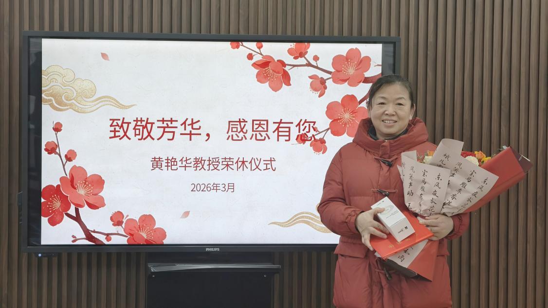 (黄艳华教授手捧荣休证书与鲜花)