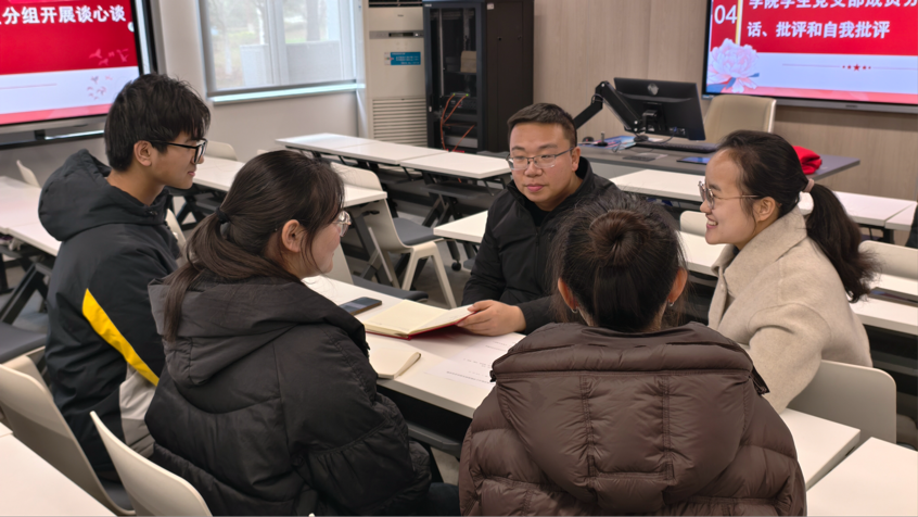 学生党员以组为单位同指导老师一起进行谈话谈心、批评与自我批评。大家本着实事求是、坦诚相见的原则,交流思想、交换意见,认真查找自身不足,相互提出中肯建议,进一步增强了党支部凝聚力与战斗力。