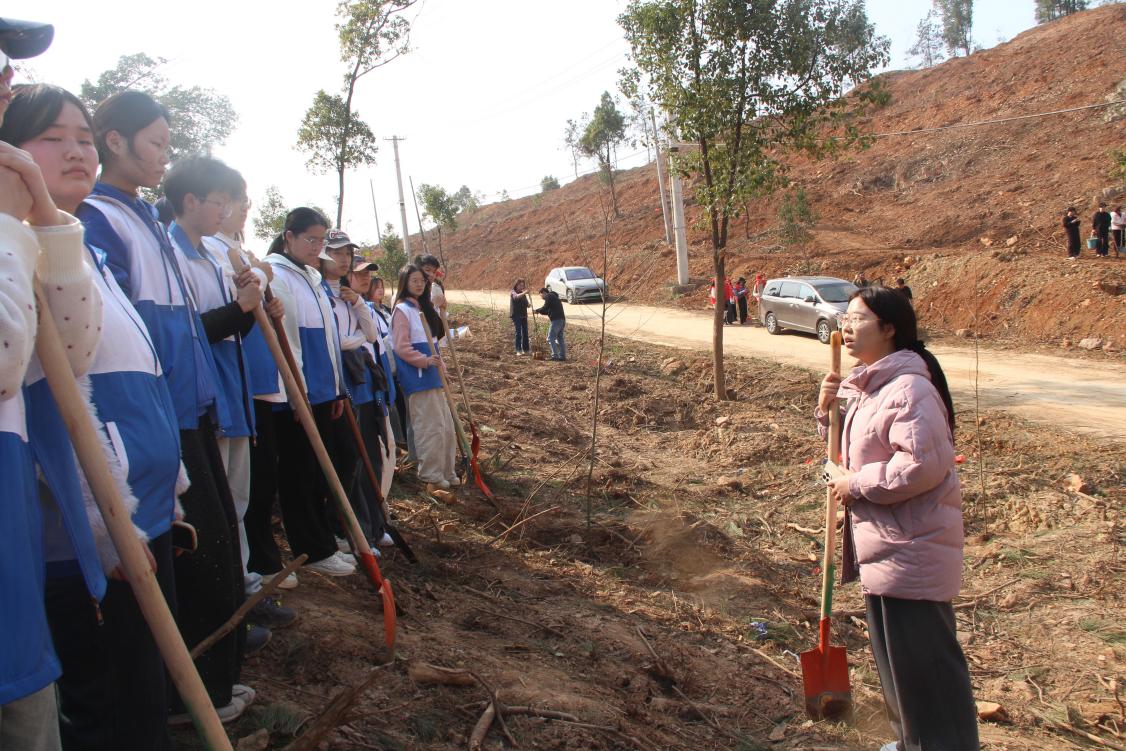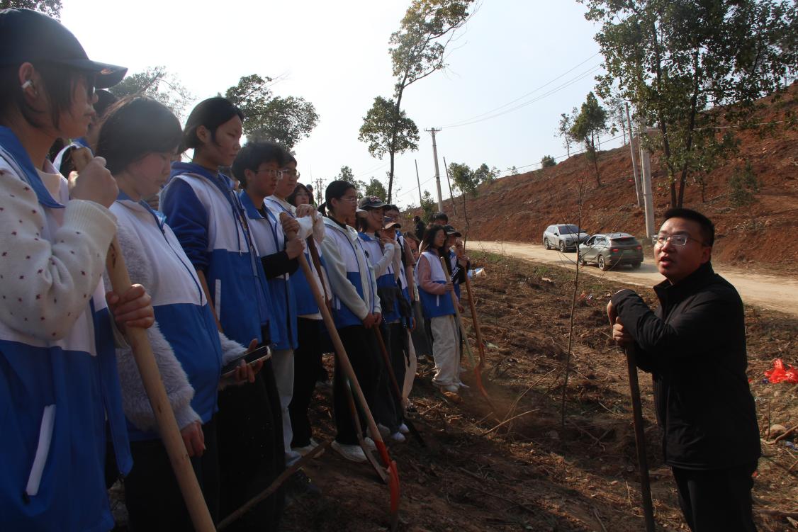 在大家种完树后,李莎老师为师生们讲解了植树节的由来,向大家介绍植树节设立是为了纪念孙中山先生,让师生们在劳动前先深入了解节日背后的历史意义与生态内涵;刘桢老师则结合学校鹤鸣工程展开讲解,详细介绍了鹤鸣工程涵盖德、智、体、美、劳五育并举的核心内容,并点明本次植树节义务植树活动,正是学校鹤鸣工程中劳动育人板块的生动实践。学院组织该活动,既是落实劳动教育与生态文明教育要求,更是将鹤鸣工程的育人理念落地,实现课堂理论与社会实践的深度结合。