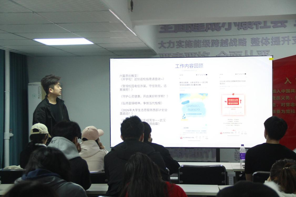 大会正式拉开帷幕后,首先进入团学各部门工作汇报环节。团学组织部、信息宣传部、学习创新部、文艺体育部等各部门负责人依次登台,结合本部门3月工作实际,进行全面细致的工作总结汇报。各负责人围绕部门工作职责,逐一梳理月度工作完成情况,从思想引领活动开展、日常团学工作落实、校园文化活动筹办、志愿服务组织等方面,详细展示工作成果与亮点,提出4月工作计划,汇报内容翔实、条理清晰,充分展现出各部门务实笃行、反思自省的工作作风,也让全体团学成员清晰地了解各板块工作推进全貌。